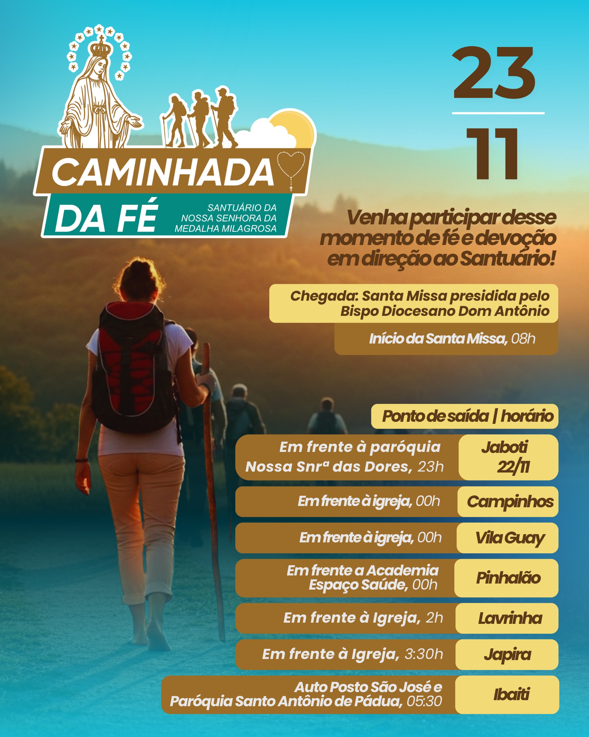 No domingo, 23 de novembro, acontece a inspiradora Caminhada da Fé, reunindo peregrinos de diversas cidades em direção ao Santuário de Nossa Senhora da Medalha Milagrosa. A chegada será marcada pela Santa Missa presidida pelo Bispo Diocesano Dom Antônio, às 8h. Pontos de saída e horários: Jaboti (22/11) às 23h, em frente à Paróquia Nossa Senhora das Dores; Campinhos (Vila Guay) às 00h00; Pinhalão às 00h00, em frente à Academia Espaço Saúde; Lavrinha às 02h00, em frente à Igreja; Japira às 03h30, em frente à Igreja Católica; e Ibaiti às 05h30, saindo do Auto Posto São José / Paróquia Santo Antônio de Pádua. A Caminhada da Fé é um momento de oração, penitência e comunhão com Deus, em que cada passo representa uma prece e uma entrega à proteção de Maria Santíssima.