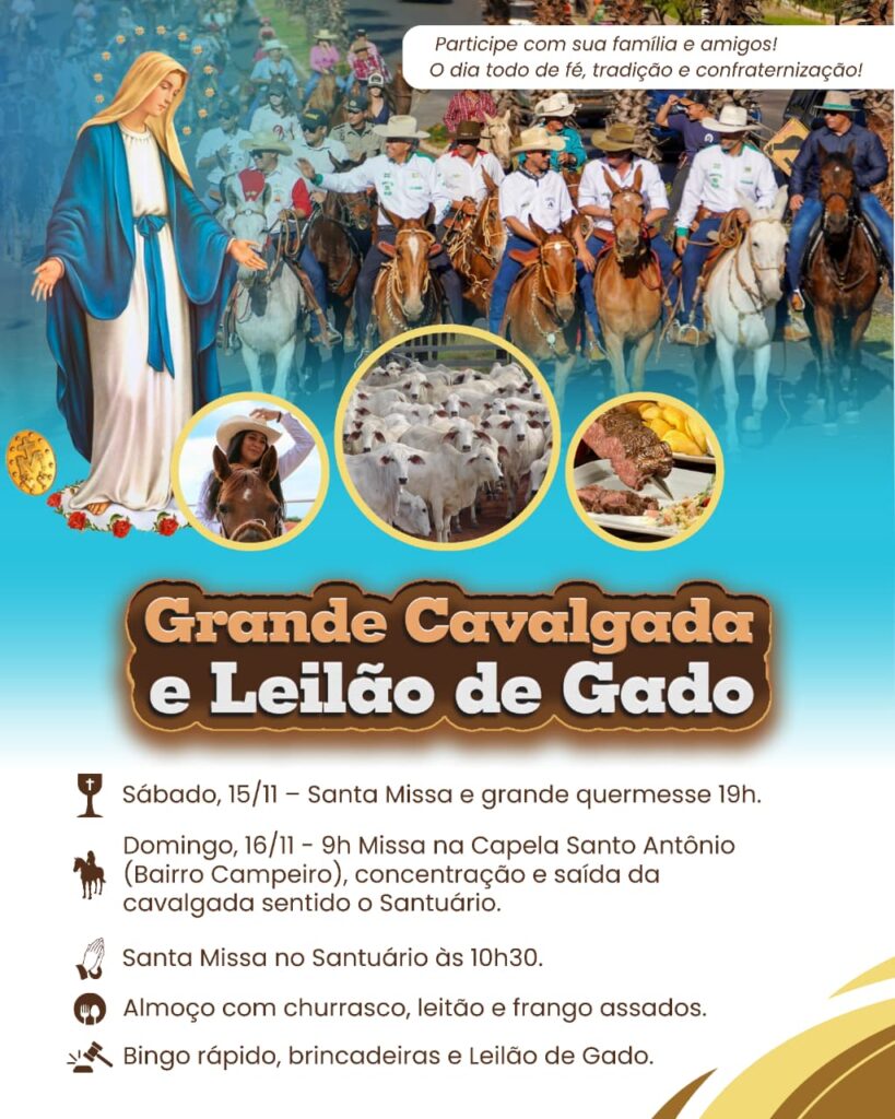 Nos dias 15 e 16 de novembro, o Santuário promove a tradicional Cavalgada e Leilão de Gado, evento que une fé, cultura e confraternização. No sábado (15), haverá Santa Missa e grande quermesse às 19h, com momentos de alegria e convivência entre as famílias. No domingo (16), a programação começa às 9h com Missa na Capela Santo Antônio, no Bairro Campeiro, seguida da saída da cavalgada em direção ao Santuário. Às 10h30, será celebrada a Santa Missa no Santuário e, na sequência, todos poderão participar de um almoço com churrasco, leitoa e frango assados. A tarde contará com bingo rápido, brincadeiras e o tradicional Leilão de Gado, encerrando um fim de semana de fé, tradição e união comunitária.