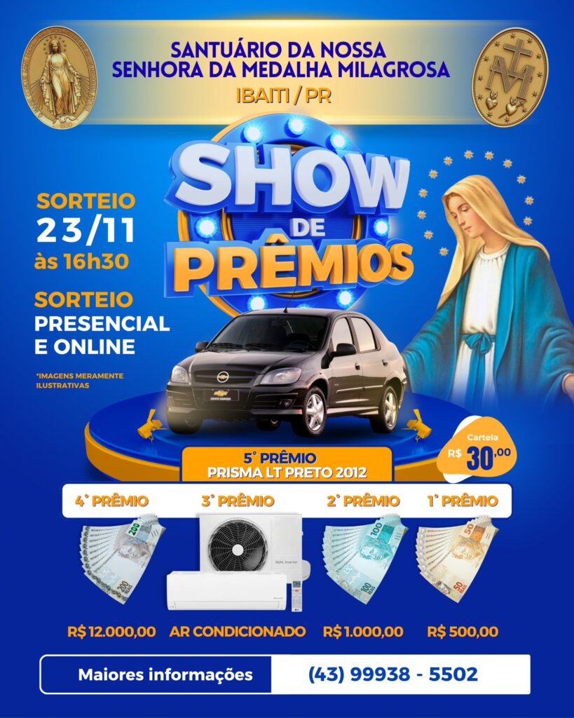 Encerrando as festividades, o Santuário realizará o grande Show de Prêmios 2025 no dia 23 de novembro, às 16h30, com sorteio presencial e online. As cartelas têm valor de R$ 30,00 e podem ser adquiridas no Santuário e na loja ao lado da Unopar. Premiação: 1º prêmio – R$ 500,00; 2º prêmio – R$ 1.000,00; 3º prêmio – Ar-condicionado; 4º prêmio – R$ 12.000,00; 5º prêmio – Carro Prisma LT Preto 2012. Mais informações e aquisição de cartelas: (43) 99938-5502.