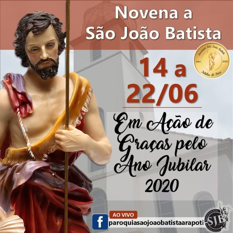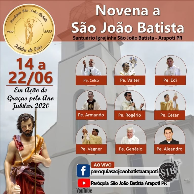 Estamos em junho, metade do ano de 2020. Ano atípico, porém, fecundo. Tempo de resinificar, refletir e escolher a melhor parte. Vamos nos preparar espiritualmente com as bênçãos de Deus e São João Batista na alegria do Ano Jubilar da nossa Paróquia. Reze conosco, rezaremos com e por você. Tome nota e vamos juntos celebrar nossa fé com padres e bispos convidados para fortalecerem ainda mais a nossa fé com a Novena, missas e bênçãos especiais para cada dia. Missas não presenciais.